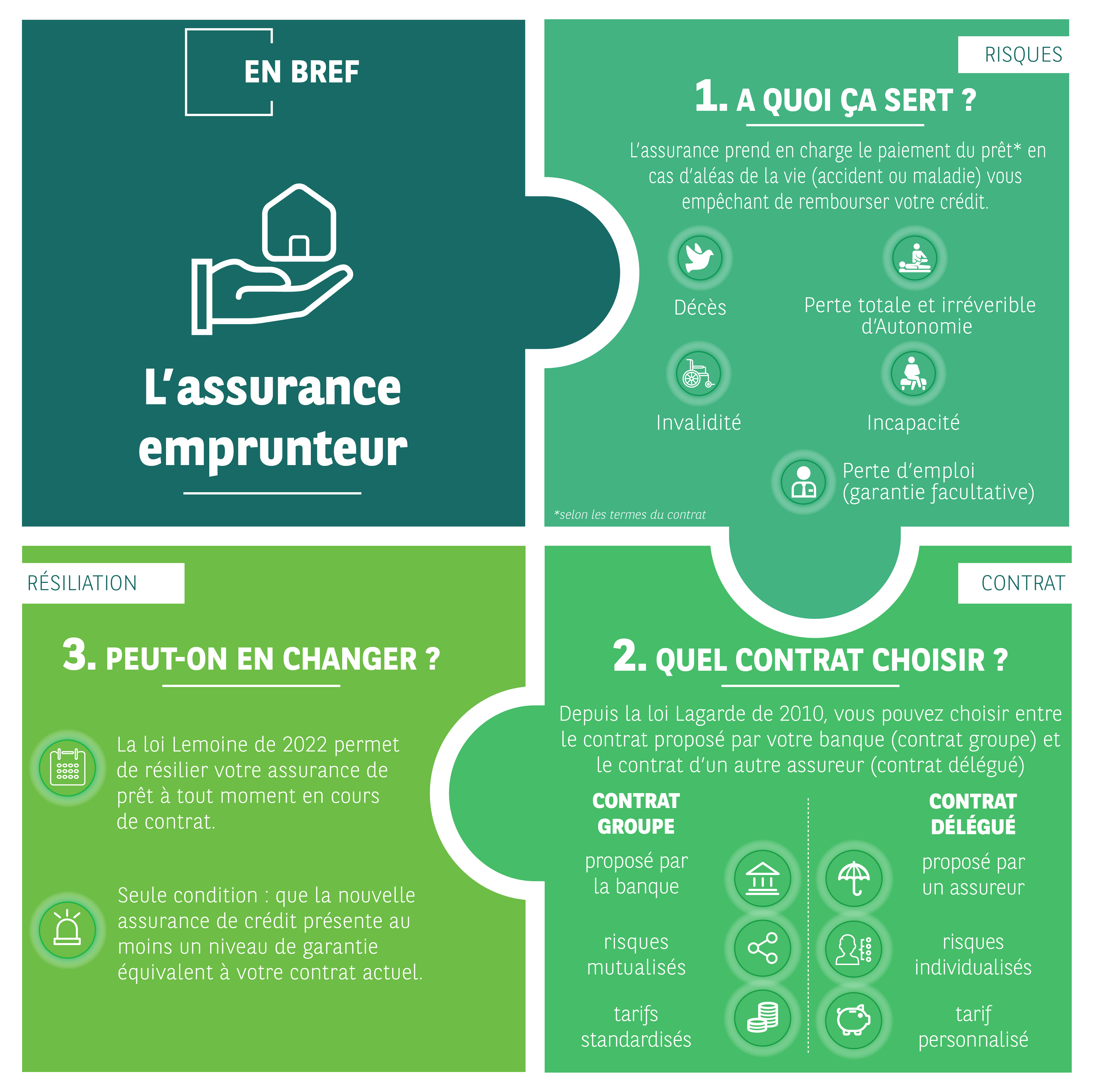 Depuis la loi Lagarde de 2010, selon votre situation, vous pouvez opter pour deux types de contrats : une assurance de groupe ou une assurance dite en délégation.